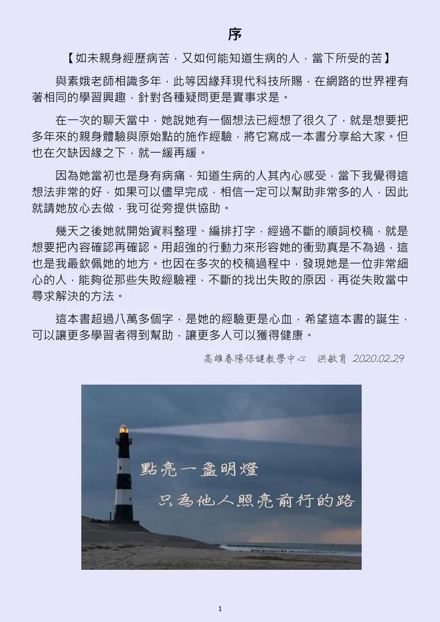 這本書超過八萬多個字,是她的經驗更是心血,希望這本書的誕生, 可以讓更多學習者得到幫助,讓更多人可以獲得健康。